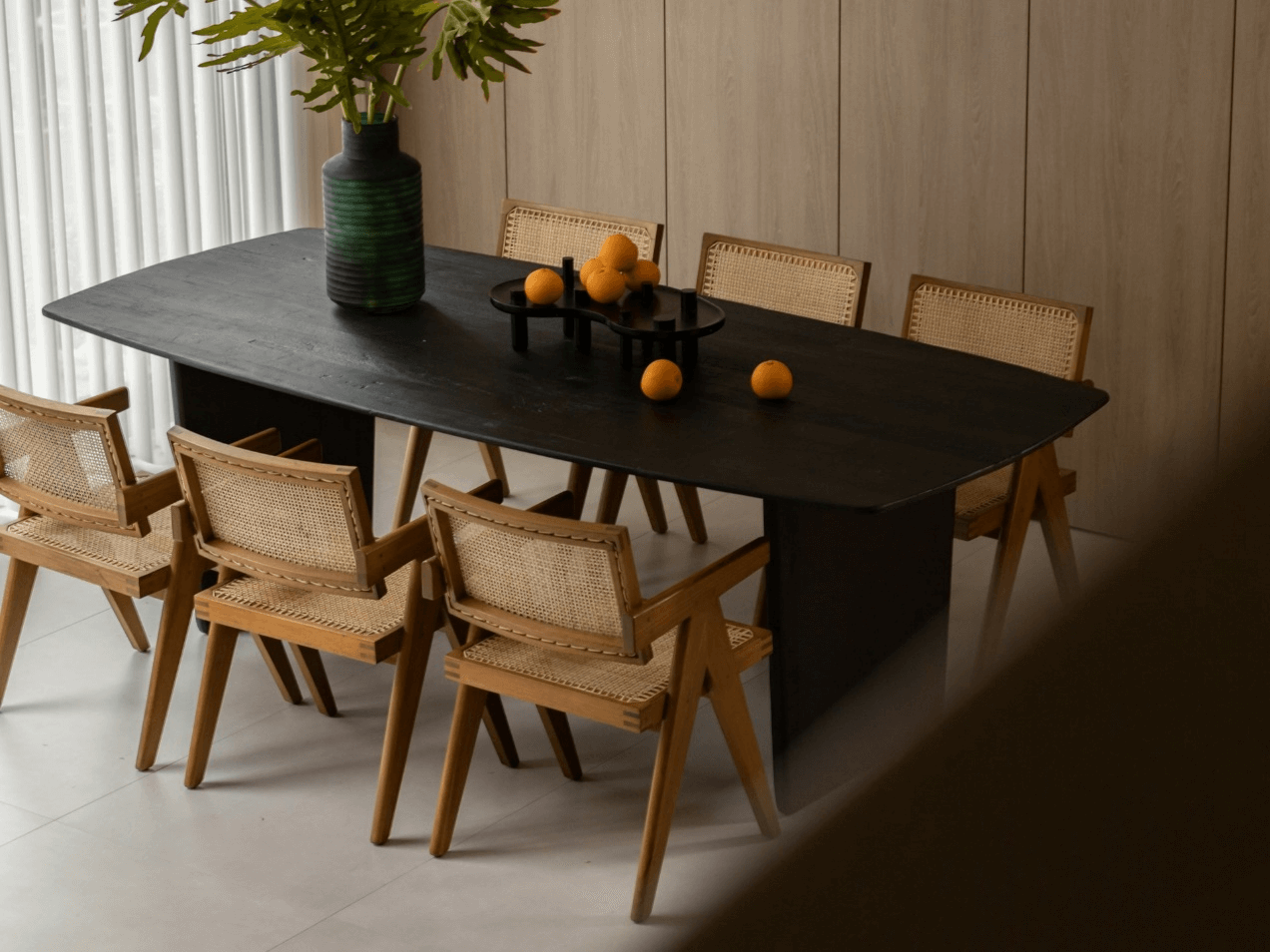 Het materiaal van het blad bepaalt de uitstraling van de tafel. Voor Deens ovale tafels zie je steeds vaker natuurlijke, rustgevende materialen. Mangohout heeft veel warmte en karakter. Marmerlook en betonlook zorgen juist voor een moderne touch. MDF met een natuursteenlook of terrazzo voegt textuur en subtiliteit toe zonder zwaar te ogen. Al deze materialen versterken de stijlvolle uitstraling van de Deens ovale tafel en helpen bij het creëren van een rustige, harmonieuze woonruimte.